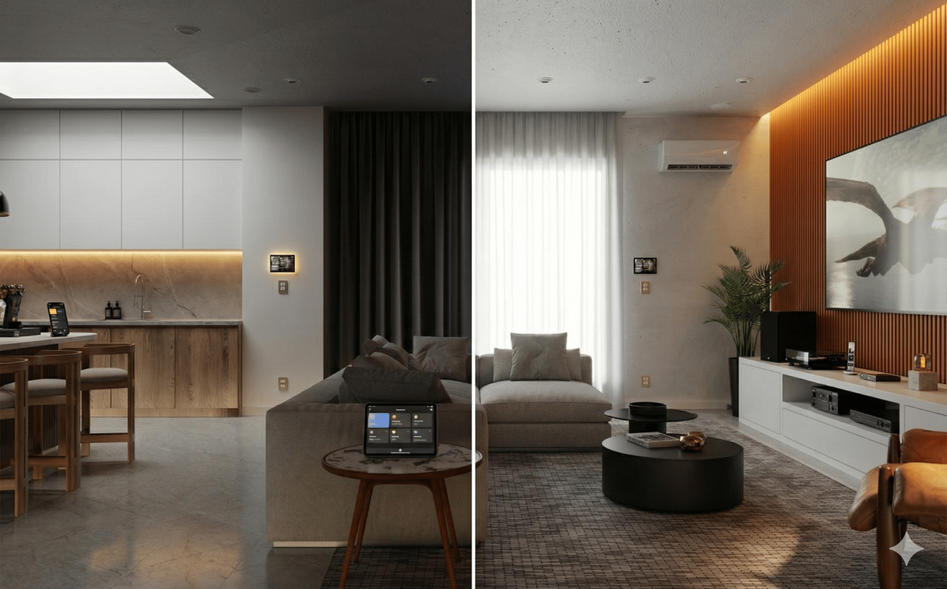 Automação não é apenas sobre ligar aparelhos, é sobre criar momentos. Nesta sala a tecnologia trabalha em harmonia com a natureza.